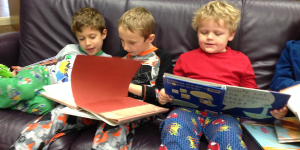 Read alouds, book talks and checkout. We host a three-month Mock Caldecott program and have author visits. Students also meet Strega Nona and Amelia Bedelia.
