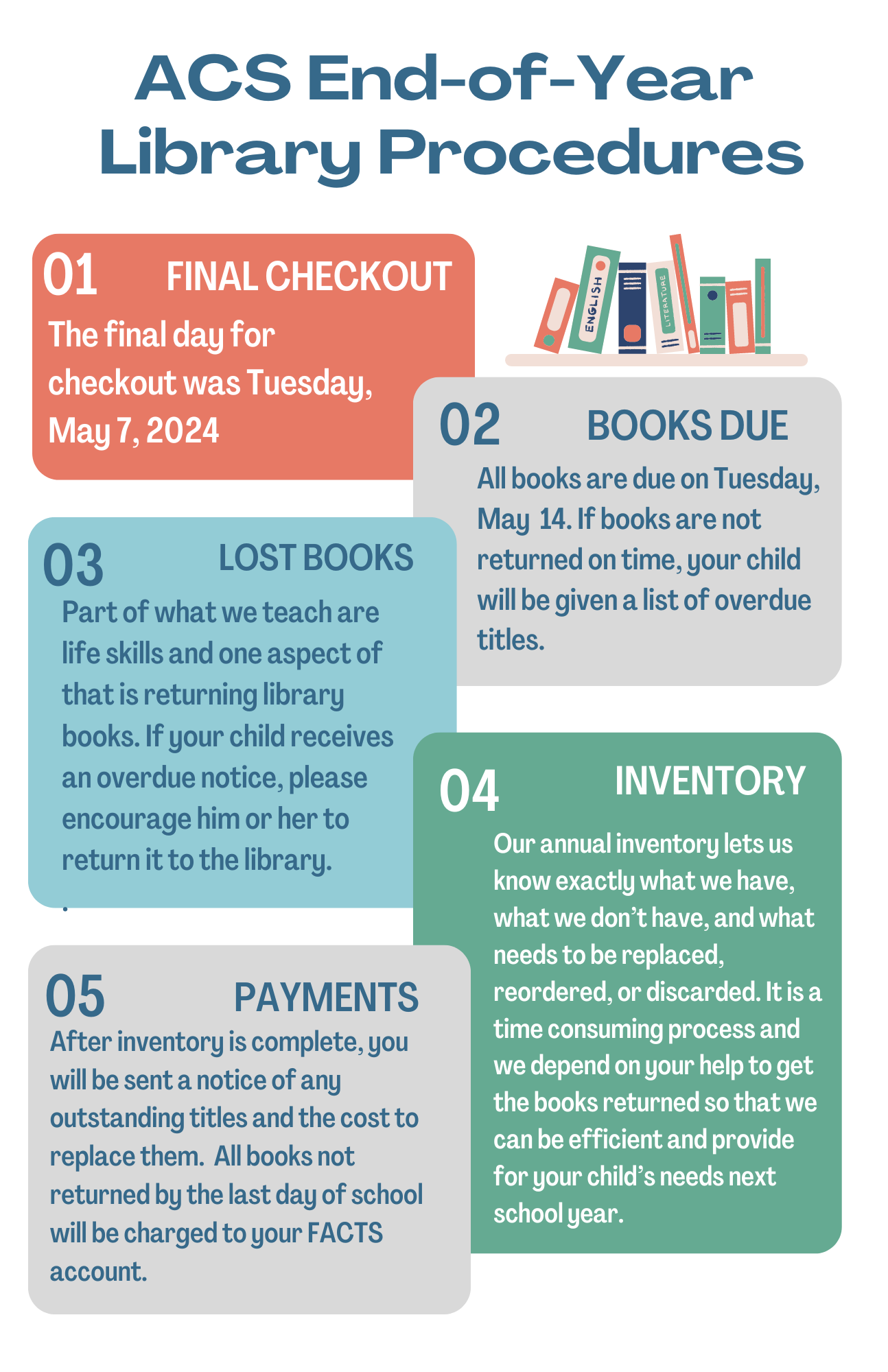 1. Checkout has ended and all books are due on Tuesday, May 14