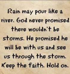Our lives change on a dime. We can plan and plan and plan, but God’s timing is not our timing and His ways are not our ways. There is a season for everything under the sun. Despite all those changes, God is constant, never changing, always there and loving everlasting. We know there are storms. We know that in this world we will have trouble, but we can take heart, because He has overcome all of that! He promised He will be with us and see us through the storm. Keep the faith. Hold on - to Him!