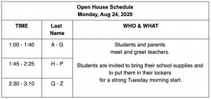 Students must stay with their parents and face masks are required for all adults and students, per State requirements. The schedule is below.