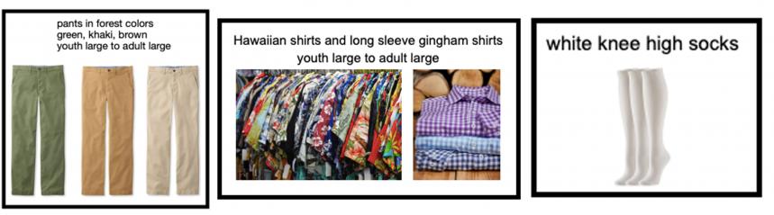 - Forest colored pants (brown, khaki, tan, beige, rust, jeans)