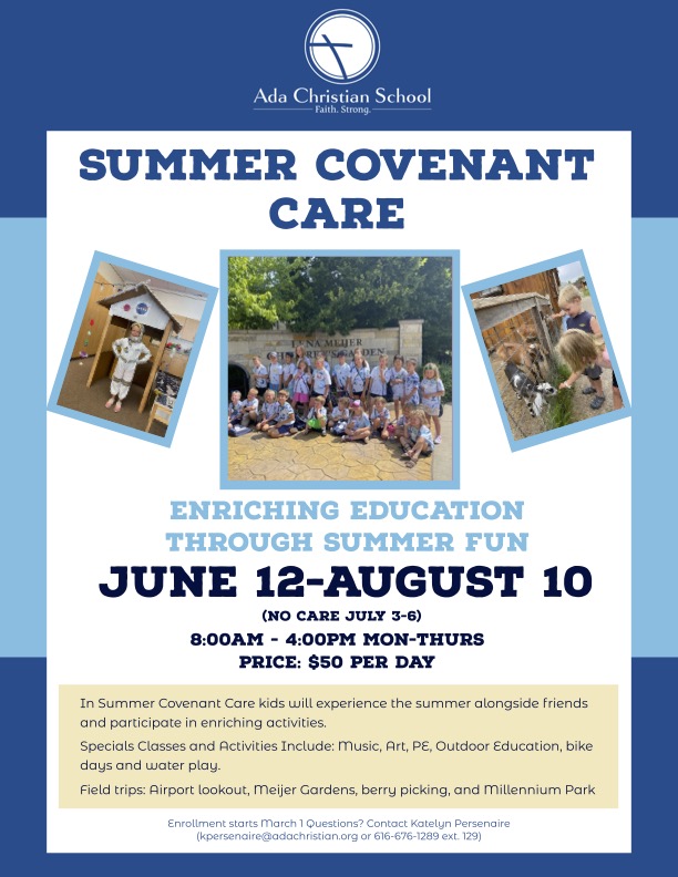 In Summer Covenant Care students will experience the summer alongside friends and participate in enriching activities. Care will be available Mon-Thurs, June 12-August 10. Sign up beings March 1.