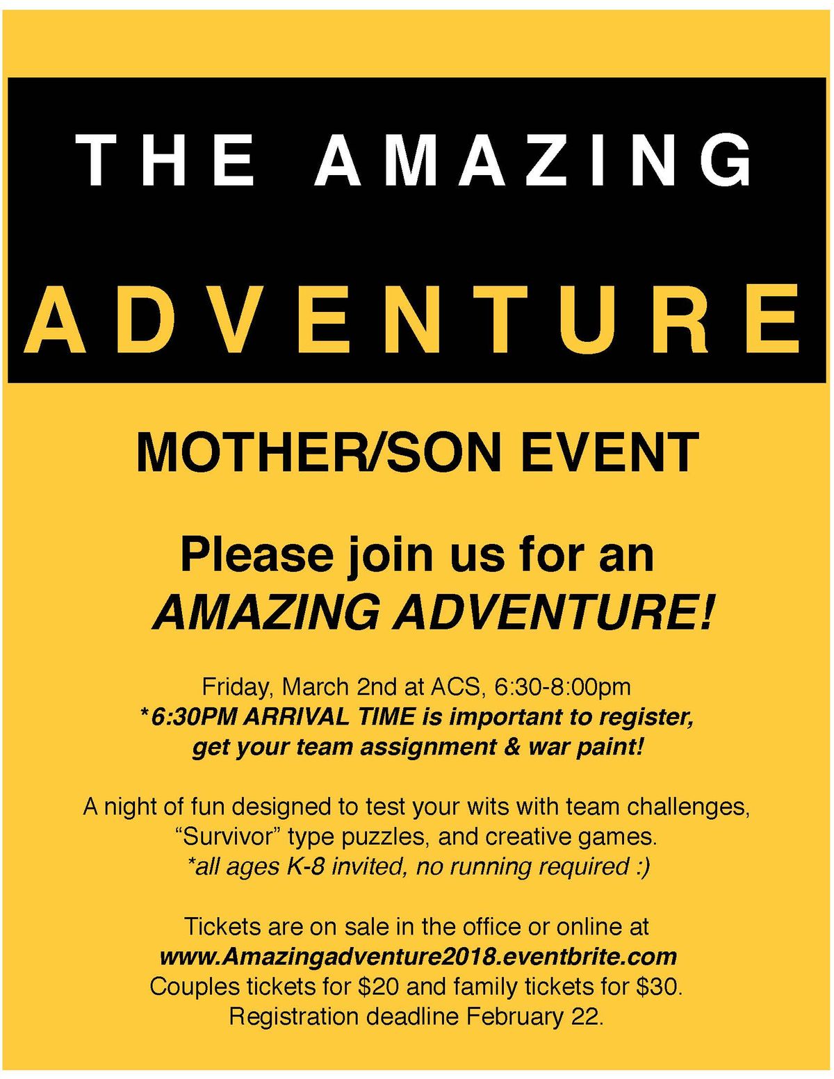 Come join us on Friday, Mar 02 and be ready for an Amazing Adventure designed to test your wits with team challenges, "Survivor" type puzzles, and creative games!