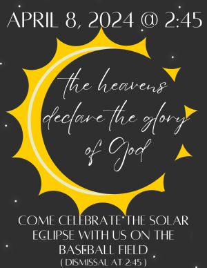 At 3:15pm on April 8, the Monday after spring break, Grand Rapids will be in the 0.01% of the world experiencing 94% darkness. The next time this will happen in Grand Rapids is 2099! Because of this, we are going to celebrate! Dismissal will occur at 2:45pm* and we invite parents and their children to join us on the baseball field for a solar eclipse party! Glasses have already been ordered for the whole school and extras for parents to purchase.