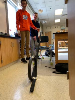 Science: We are finishing up our unit of Gravity and Kinetic Energy studying the relationship between potential energy and kinetic energy by making marble ramps and calculating the value of gravitational potential energy needed for the marble to make it fully through the loop the loop.