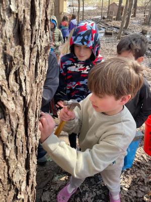 Kindergarten was able to really enjoy winter. We took a turn with the snowshoes when we had deep snow on the ground and the woods were looking beautiful. Later we did activities with sleds in the last remnants of a snowfall to practice the letters they had been learning. We also enjoyed a puppet show to learn about animals in winter, learned different types of ducks and adaptations they have for feeding and searched for a “peppermint beetle” using our sense of smell, and practiced counting with things we found outside. To wrap up the month, we learned about maple syruping at the sugar shack and tapped a tree as a class.