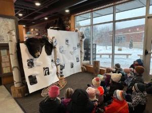 First grade began by taking a close look at what we could find in the woods. There are many interesting things we can find when we stop to take a look. We then played a few Predator and Prey games in the woods and learned about how animals interact with each other. We also took time to work with herbs in the greenhouse. Then we went into the woods to look for signs of animals and plants using trees and the importance of trees in the forest. First grade enjoyed another round of the animals in the winter puppet show with a new script. Lastly, wrapped up the month with a snowshoe outing!