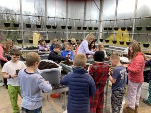 3rd - March had 3rd graders digging into soil planting seeds and plants in the greenhouse preparing for Spring. The viola's that we planted in February were upsized into 4" plastic pots. We also planted plant plugs into hanging baskets for Mother's Day. Each student planted 1 10" hanging basket. It's been amazing to watch the changes in the potted plants and baskets each week! The students are so proud of their plants and love to look for 'their' hanging basket to check on it.