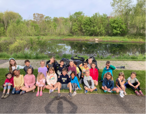 One major theme of first grade in the spring is sound. We search for sound and explore how it is used outside. Then we spend time exploring different materials that we can use to make sound and music outside. The class then spent time using sound to hunt for a camouflaged Mr. Sportel hiding in the woods. We wrapped up sound by playing a few games that help us explore animals and sound. In addition, first grade explored the beauty outside by looking for pieces of nature to add to their tape bracelet. First graders also had a chance to help out at school by removing invasive species. I was blown away when they filled enough trash bags of garlic mustard to fill the bed of our pickup truck! They were great workers helping to restore God’s Creation!