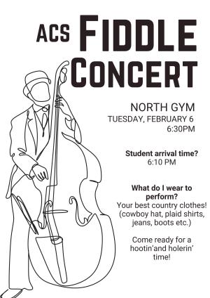 We invite you to our country themed Fiddle Concert on Thursday, February 6 at 6:30pm in the North Gym. We are excited to show you some things we’ve been practicing.