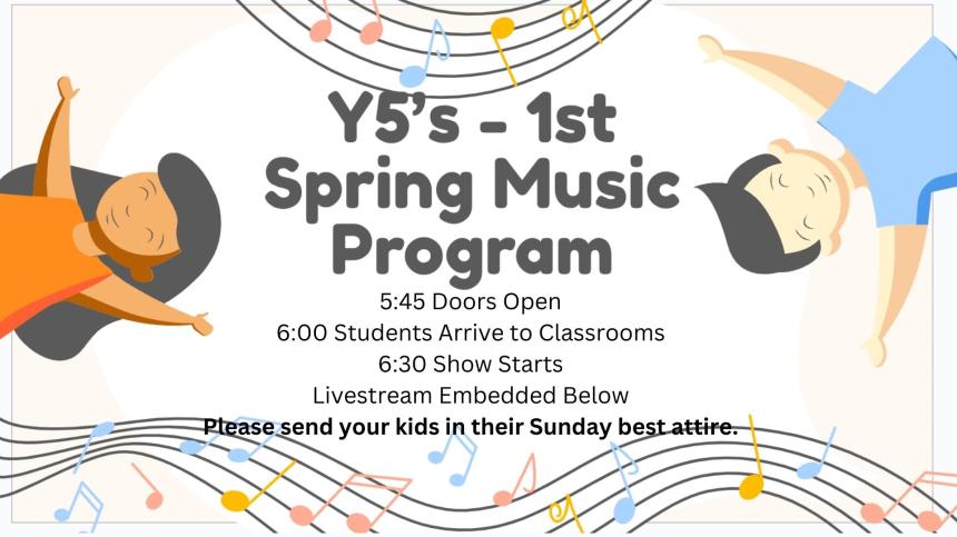 We are excited to invite you and your family to our Y5’s - 1st Grade Spring Program on Tuesday, March 11 from 6:30 - 7:15 pm. Doors will open at 5:45pm and students should arrive to their classroom between 6:00-6:15pm. The program will begin at 6:30pm in the South Gym. We look forward to celebrating and worshiping our God together. We will be streaming the program embed below.
